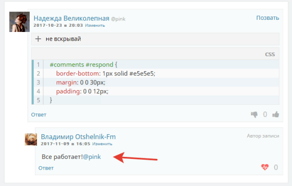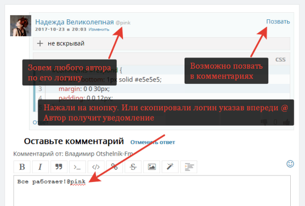 Таким образом, зная логин - можно позвать в комментарии любого пользователя. Логин, например, виден в урл строке - перейдя в кабинет нужного автора.