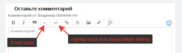 Технический ресурс никак без вставки кода не обойдется. Чтобы вам было удобно рассказать и показать ваш код - есть 2 кнопки "Многострочный код" и "Однострочный код":