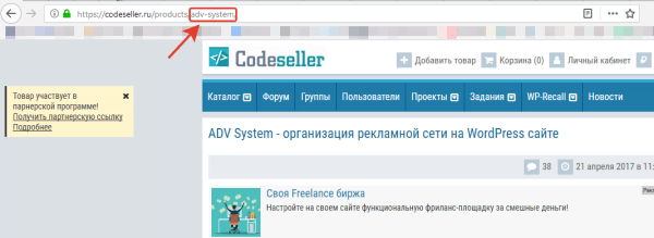 3.2. Выбираем из каталога товар, который участвует в партнерской программе. Обычно урл и является slug (слаг) дополнения. Подробней, какой слаг у дополнения, вы можете уточнить у автора товара в комментариях или через личные сообщения сайта.